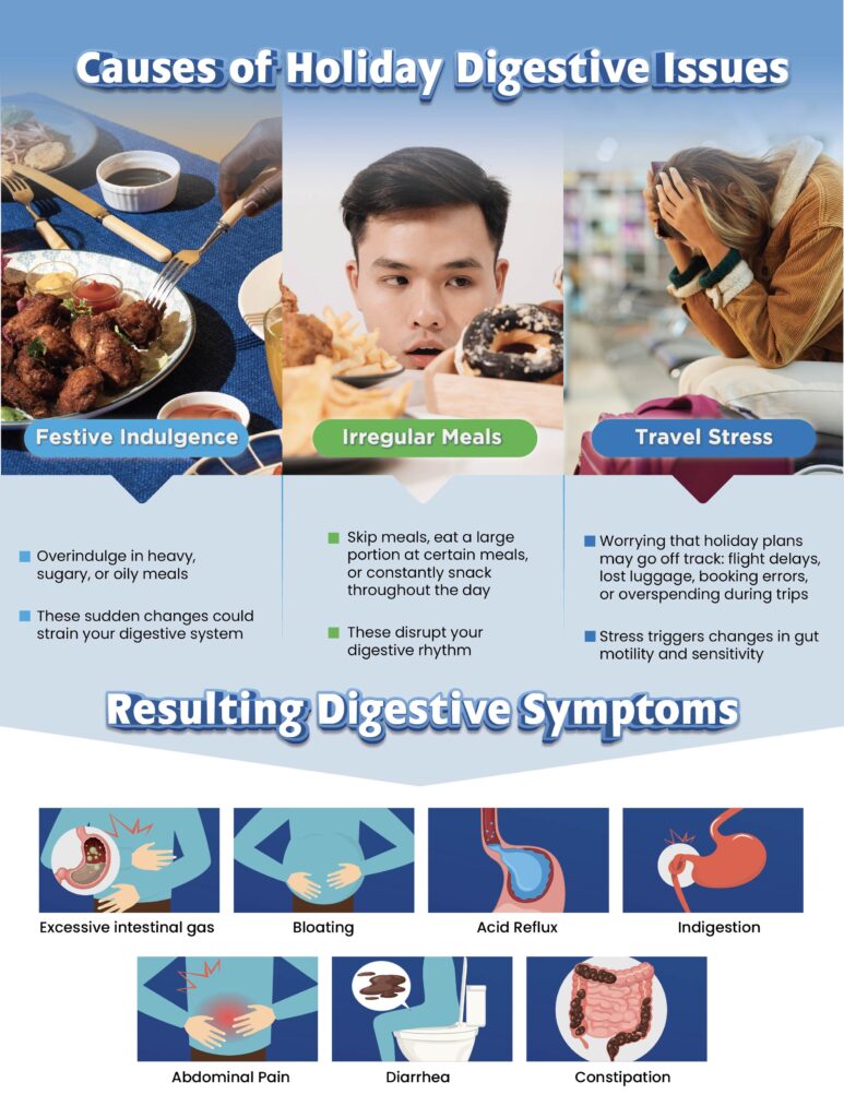It refers to digestive issues such as gas, bloating, indigestion, sluggish digestion, diarrhoea, or constipation that are commonly observed during the holiday season because of sudden changes in diets, eating habits, and routines.